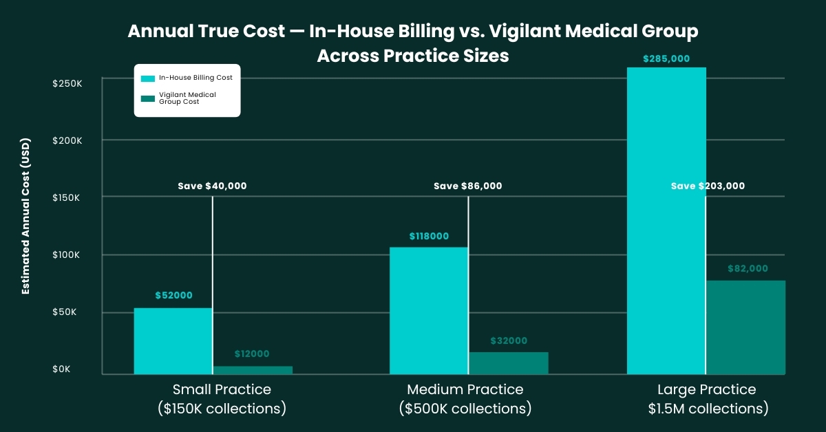 | Cost Category | In-House Billing (True Annual Cost) | Outsourced to Vigilant Medical Group |