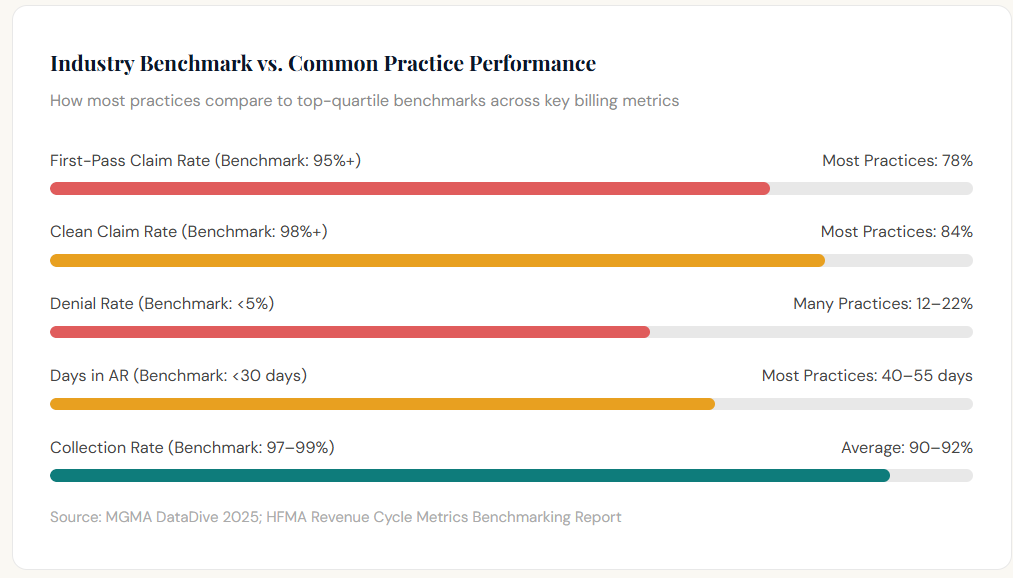Practices that track and review billing KPIs on a weekly basis, rather than monthly or quarterly report 23% higher collection rates and resolve claim denials an average of 11 days faster than those who review metrics less frequently.